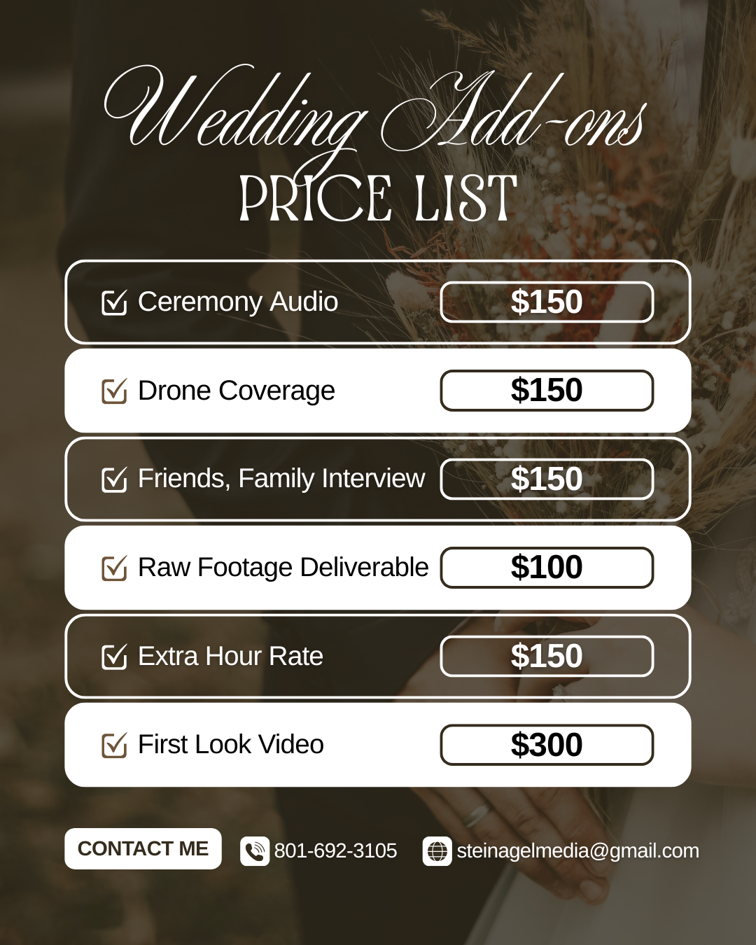 Every wedding is unique, which is why I offer a variety of professional add-ons to enhance your final production.